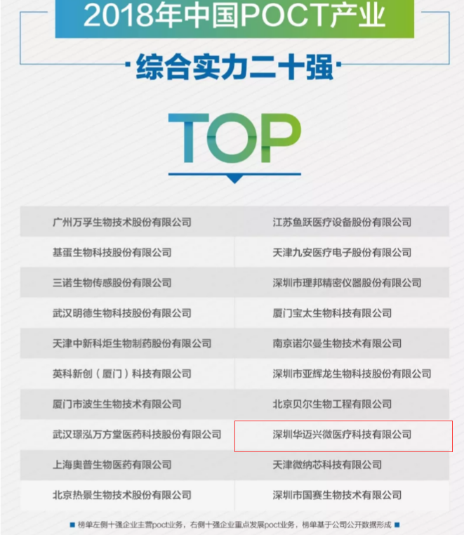 由中國醫(yī)學(xué)裝備協(xié)會(huì)現(xiàn)場快速檢測(POCT)裝備技術(shù)分會(huì)主辦的“2018中國 POCT 年會(huì)”日前在杭州召開。大會(huì)根據(jù)上市產(chǎn)品、融資能力、知識產(chǎn)權(quán)、企業(yè)規(guī)模、創(chuàng)新能力等多維度加權(quán)得分,評選出國內(nèi)綜合實(shí)力最強(qiáng)的二十家POCT企業(yè),其中包括了萬孚、魚躍、九安、三諾、基蛋、理邦、明德等七家上市企業(yè)以及多家老牌IVD領(lǐng)軍企業(yè)。而創(chuàng)建于2014年、推出全球首家基于微流控平臺的化學(xué)發(fā)光POCT解決方案的華邁興微也脫穎而出入選,成為創(chuàng)立時(shí)間最短的上榜企業(yè)。