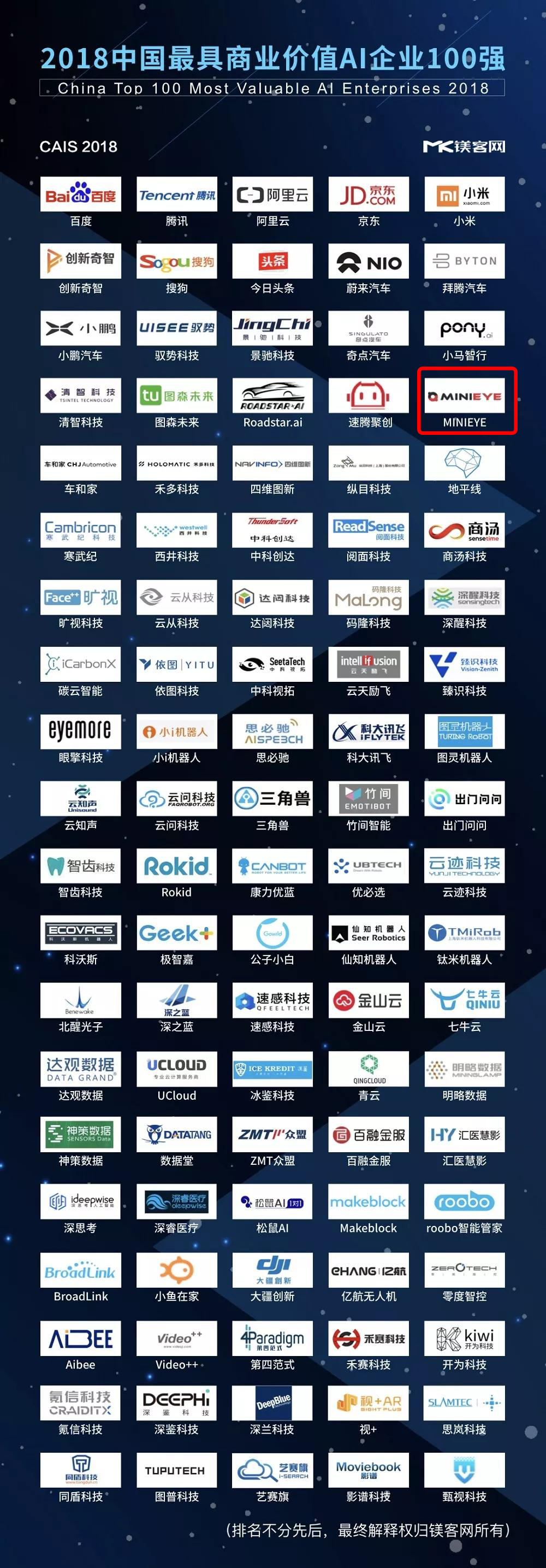 日前,在2018中國(guó)人工智能峰會(huì)(CAIS 2018)上,硬科技產(chǎn)業(yè)媒體鎂客網(wǎng)發(fā)布“2018中國(guó)最具商業(yè)價(jià)值A(chǔ)I企業(yè)百?gòu)?qiáng)”榜單。中國(guó)最落地的視覺(jué)智能駕駛技術(shù)公司—MINIEYE入選榜單。