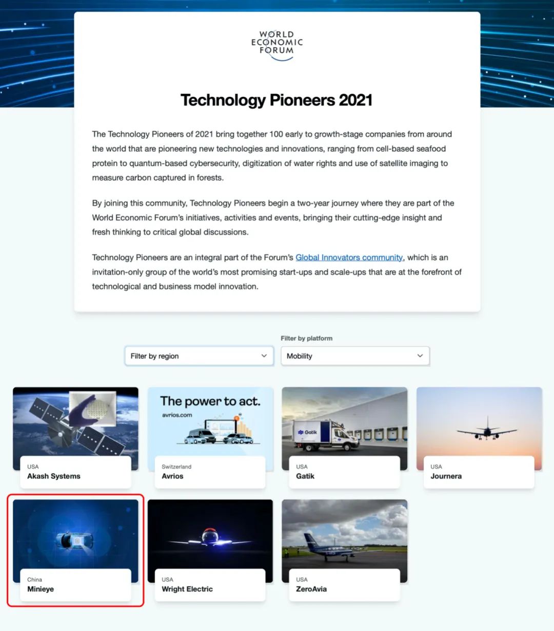美國(guó)當(dāng)?shù)貢r(shí)間2021年6月15日,世界經(jīng)濟(jì)論壇(又稱“達(dá)沃斯論壇”)發(fā)布了2021年度技術(shù)先鋒榜單,從全球范圍內(nèi)選出了100家新興科技企業(yè)。專注于自動(dòng)駕駛技術(shù)研發(fā)的MINIEYE(深圳佑駕創(chuàng)新科技有限公司)成為8家獲選的中國(guó)企業(yè)之一。