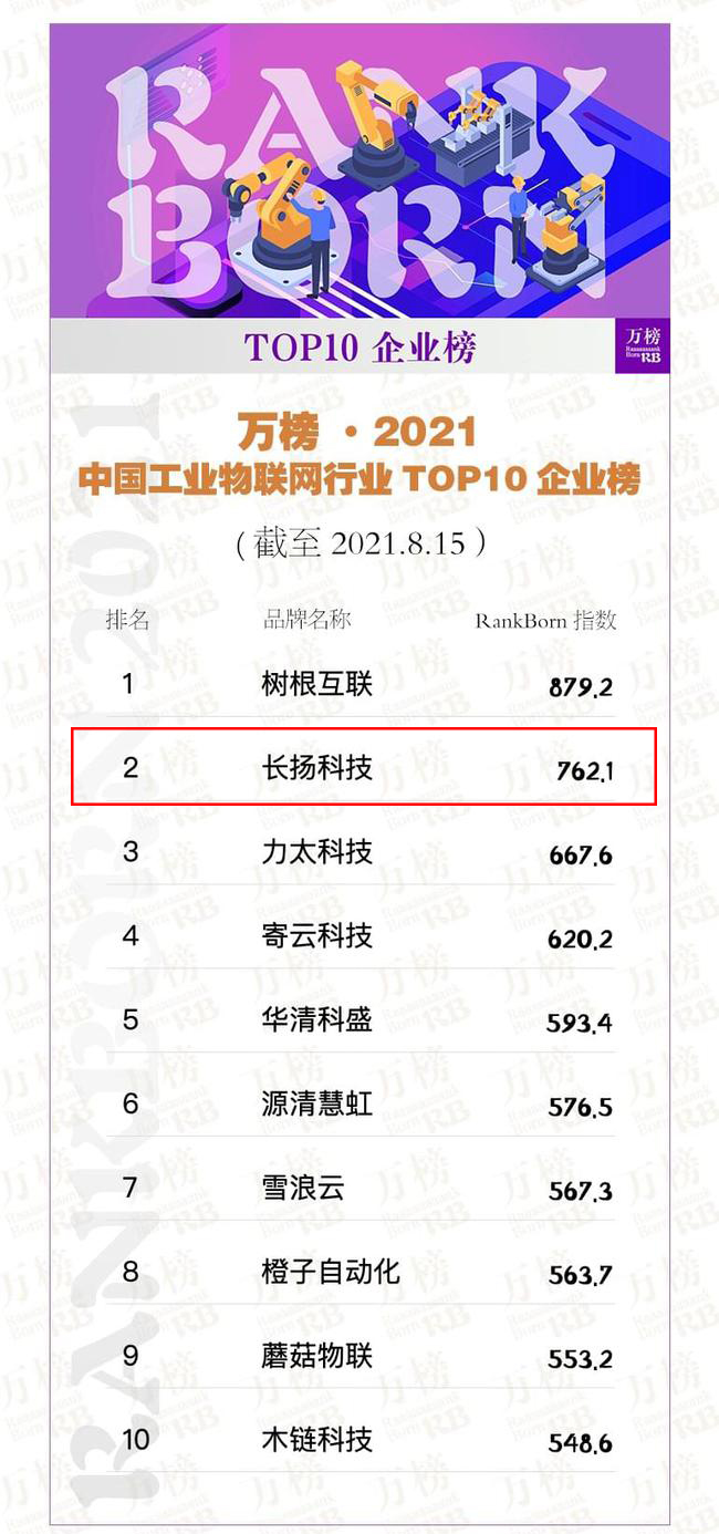 8月19日,萬(wàn)榜發(fā)布“2021中國(guó)工業(yè)物聯(lián)網(wǎng)行業(yè)TOP10企業(yè)榜”,長(zhǎng)揚(yáng)科技憑借專利情況、融資規(guī)模等多個(gè)維度的領(lǐng)先優(yōu)勢(shì),綜合實(shí)力位居第二。
